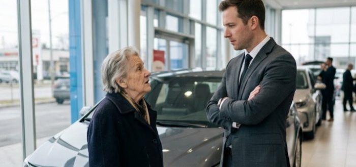 Staršia žena v starom kabáte ticho otvorila dvere drahého autosalónu. Vo vnútri sa vznášala vôňa nových áut a drahých parfumov a lesklé vozidlá stáli v rovných radoch ako