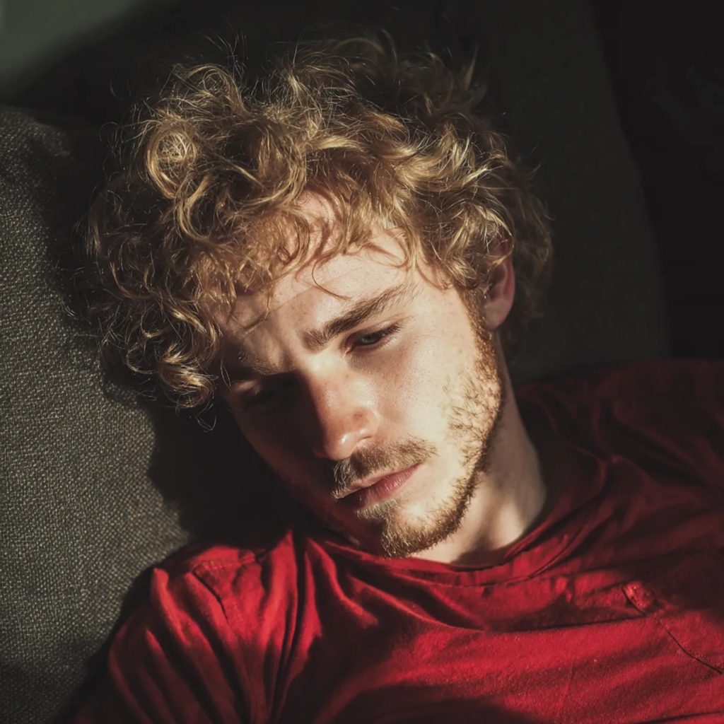 TEJ NOCI MARK SPAL STOČENÝ DO KLbKA NA SVOJOM ÚZKOM PÁSE MATRACA, PRIKRYTÝ ŠKRABAVOU DEKOU.