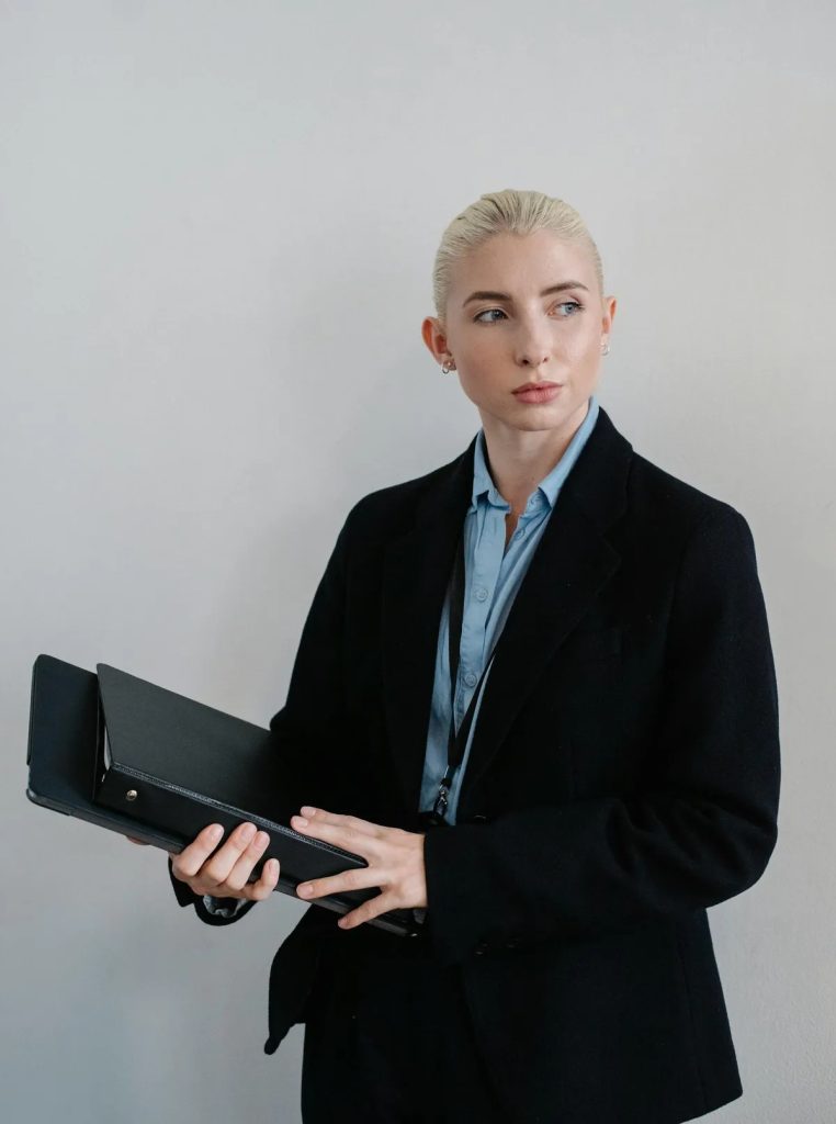 Vo dverách stála žena po štyridsiatke v tmavomodrom saku s hrubou zložkou v ruke. Vedľa nej vysoký muž so zápisníkom.