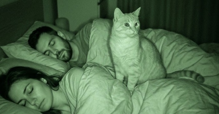 Na zázname bolo jasne vidieť: len čo sme zaspali, mačka vyskočila na posteľ a sadla si k nám. Nezaujímala som ju — celý čas uprene sledovala iba môjho manžela. Dokázala tak sedieť takmer hodinu, úplne bez pohybu.