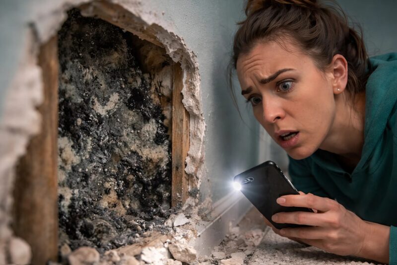 Zapla som baterku na telefóne a posvietila som do vnútra steny. Lúč svetla prešiel po drevených trámoch a izolácii — a v tom okamihu mi prešiel telom studený mráz.