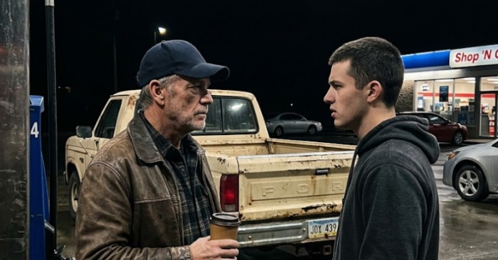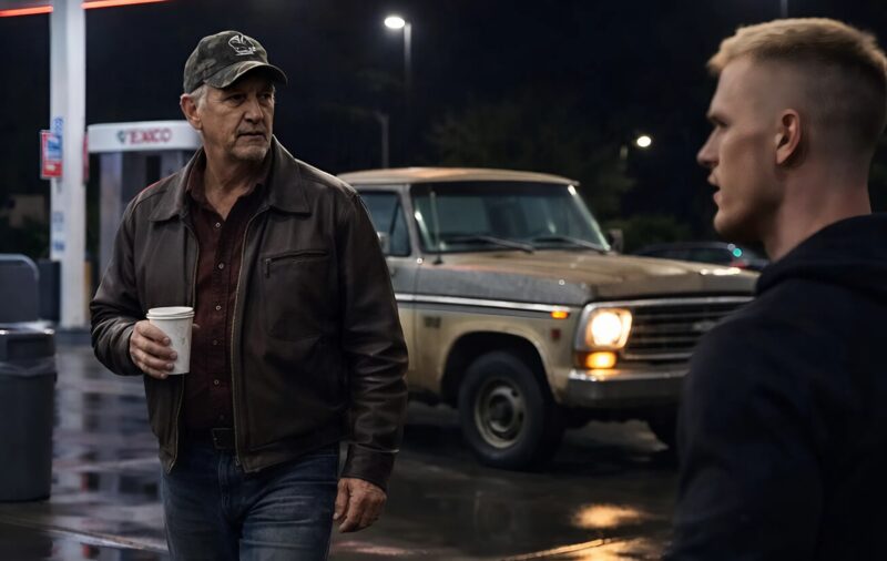 Nočná čerpacia stanica bola takmer prázdna. Pod prístreškom lampy ticho bzučali, na mokrom asfalte sa trblietali červené a biele odrazy z tabule, a okolo panovala ticho. V malom obchode za pokladňou driemal unavený pokladník, ktorý občas zdvihol hlavu, aby po chvíli opäť sklopil viečka.