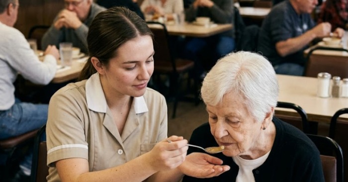 Pretože žena, ktorú niekto práve s takou starostlivosťou kŕmil… bola jeho matka.