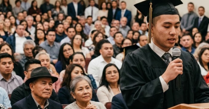— Dobrý deň — začal. — Mnohí z vás ma poznajú ako výnimočného študenta. Ale väčšina ma pozná ako „syna smetiara“.